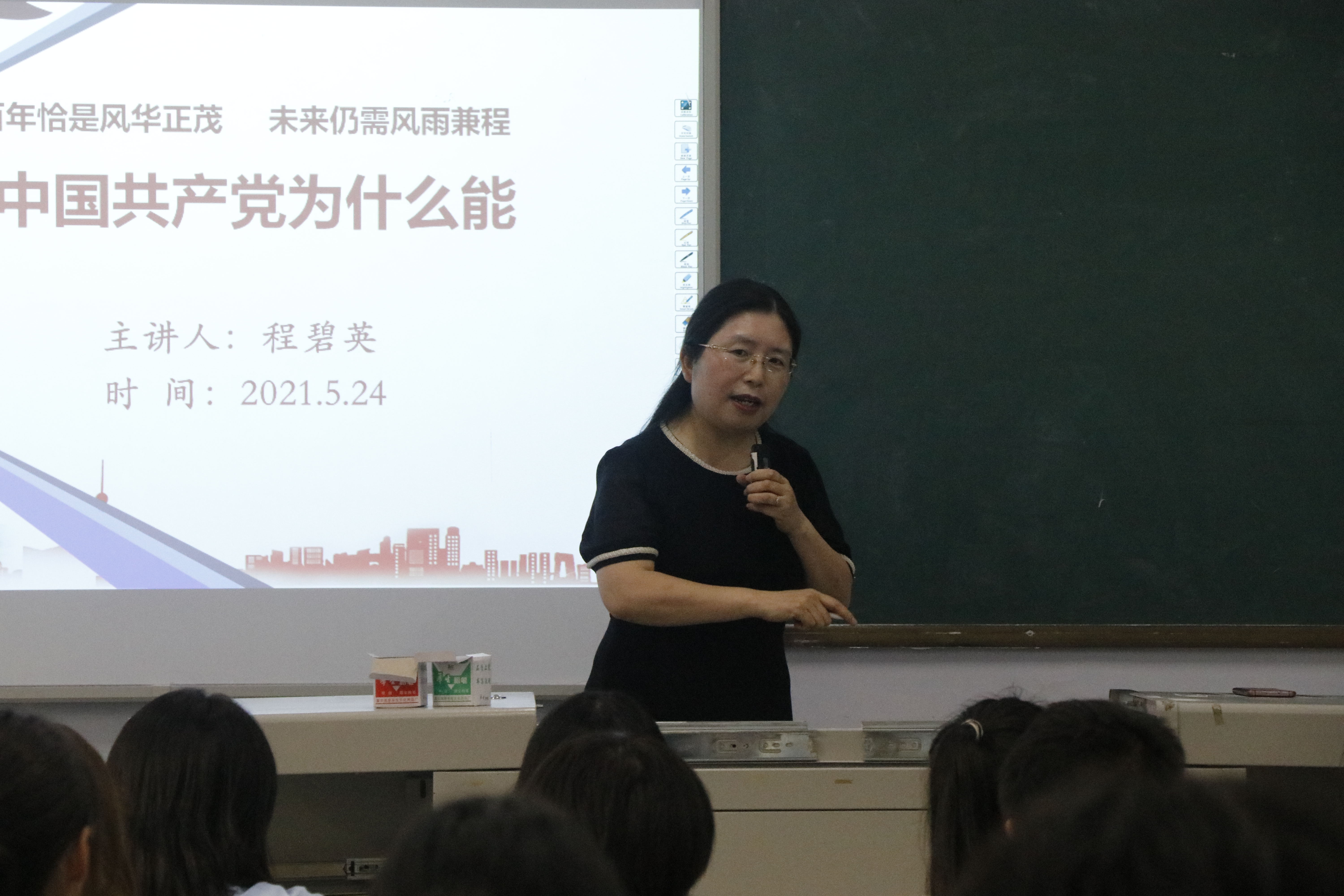 为深入开展党史学习教育,宣传党史知识,教育引导老员工学党史、悟思想、办实事、开新局,5月24日晚,副董事长程碧英教授在博文楼221教室为美术公司学子讲授题为《中国共产党为什么能》的形势与政策课。